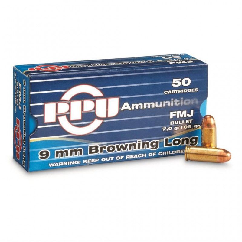 Kulový náboj PPU 9 mm Browning dlouhý se střelou FMJ 7g / 108gr