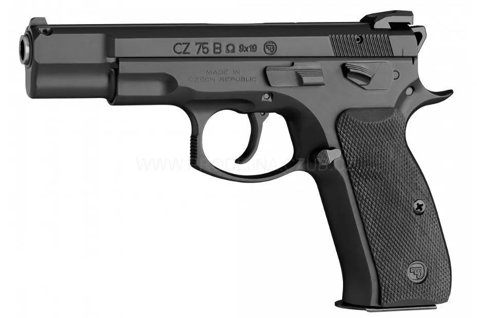 Samonabíjecí pistole CZ 75 B Ω, ráže 9 mm Luger, ocelový rám, hmotnost 1000 g, délka hlavně 114 mm, pevná mířidla, plastové střenky